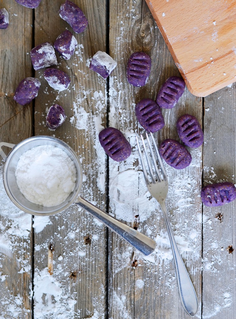 Zubereitung: Weiche die Cashewkerne in einem Glas mit warmem Wasser ein. Jetzt werden die Kartoffeln so lange abgekocht bis sie schön durch sind. Sobald sie fertig sind, werden die Kartoffeln geschält und ganz gleichmäßig mit einer Gabel zerdrückt bzw. mit der Kartoffelpresse bearbeitet. Währenddessen kann schonmal ein großer Topf mit Wasser aufgestellt und zum kochen gebracht werden. Der Kartoffelbrei wird nun mit ein wenig Wasser (ich habe circa 5 Esslöffel Wasser hinzugefügt), ein wenig Salz, Pfeffer und dem Kartoffelmehl zu einer stabilen Masse vermengt. Ich habe mit den Händen geknetet, das funktioniert eigentlich am besten! Eventuell musst du noch ein wenig Wasser oder Kartoffelmehl hinzufügen. Nun werden die Gnocchi geformt. Achte darauf, dass du sie wirklich gut in deinen Händen hin und her rollst, bis sie schön fest sind. Nächster Schritt: Die Gnocchi kommen in das kochende Wasser. Dort bleiben sie nur ganz kurz, genauer gesagt so lange bis sie oben auf schwimmen. Nun kannst du sie herausholen, mit Wasser abspülen und gemeinsam mit den Zwiebelstücken in Kokosfett anbraten. Je knuspriger du sie brätst, desto besser schmecken sie, zumindest finde ich das haha! Nun holst du die Cashewkerne aus dem Glas und pürierst/mixt sie mit circa 130ml frischem Wasser, Salz und Pfeffer. Du kannst auch ein bisschen mehr oder weniger Wasser nehmen, je nachdem wie flüssig oder cremig du deine Sauce haben magst. All das wird jetzt zusammen mit frischem Basilikum/ein paar Rucola Blättern oder was auch immer du gerade zuhause hast serviert und verspeist 🙂 Ich habe beispielsweise Jungzwiebel genommen, daraus könnt ich jetzt ein Suchspiel machen. Wer findet die Jungzwiebeln auf den Fotos? PS: Lass es dir schmecken!! PPS: Lieber zu viel als zu wenig Kartoffelmehl verwenden, sonst überleben unsere lila Schönheiten das Wasserbad nicht!