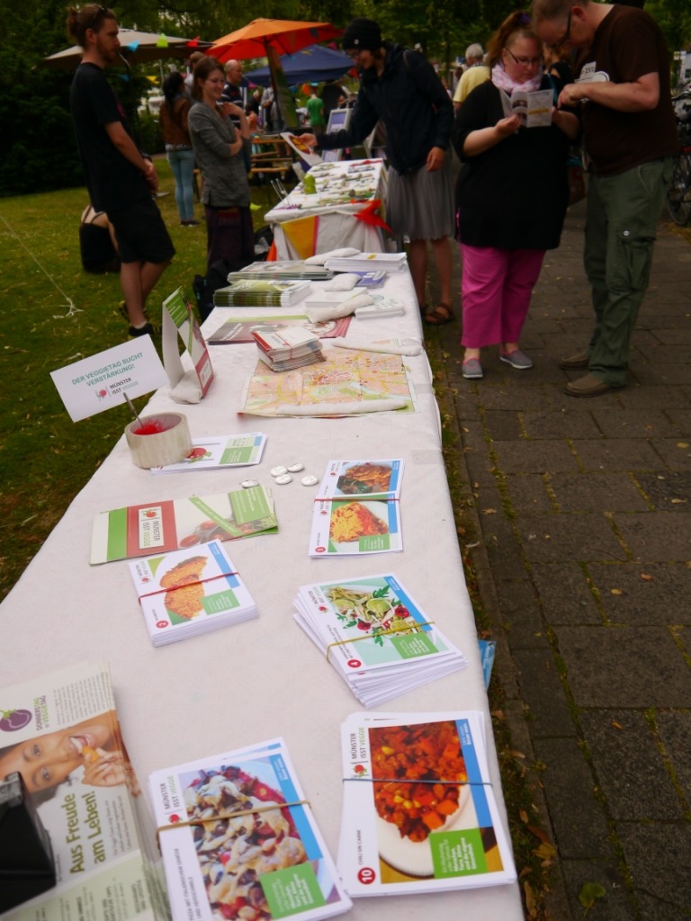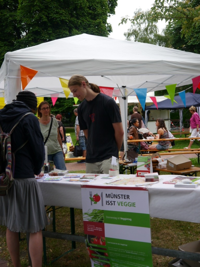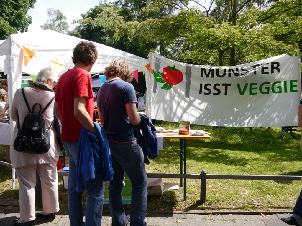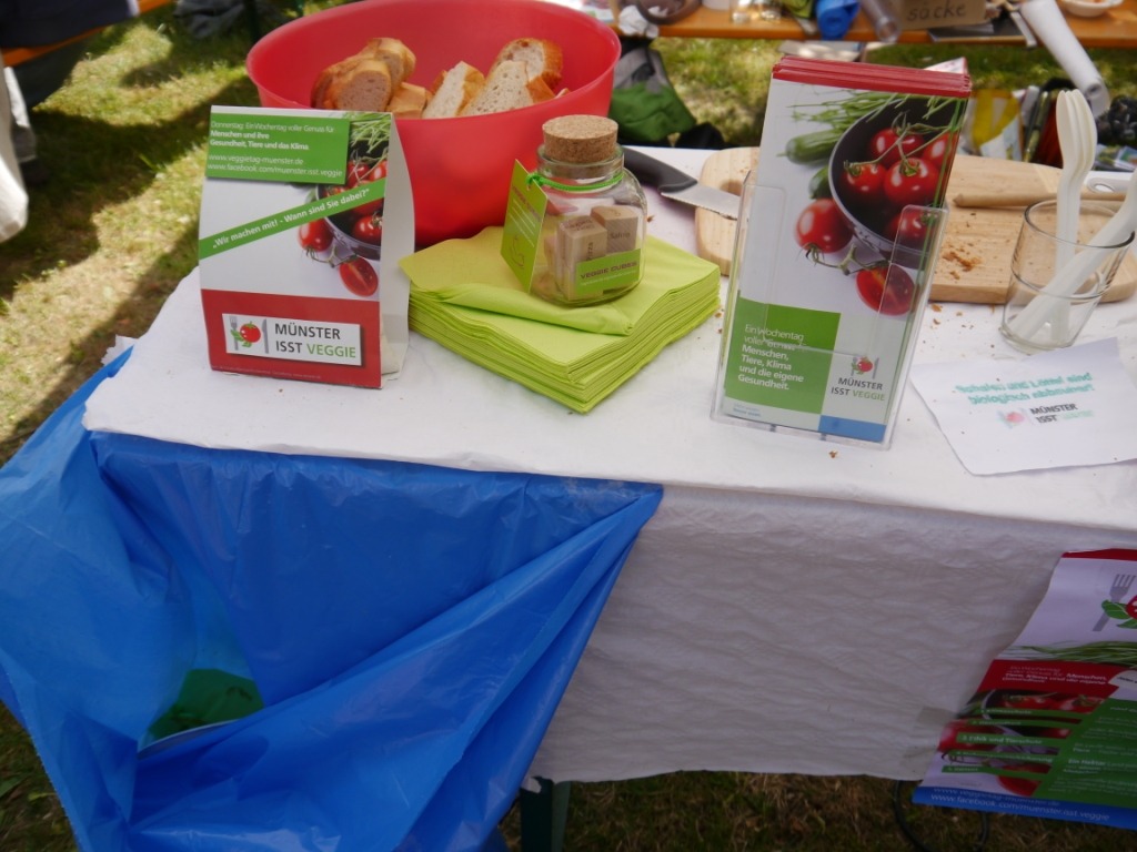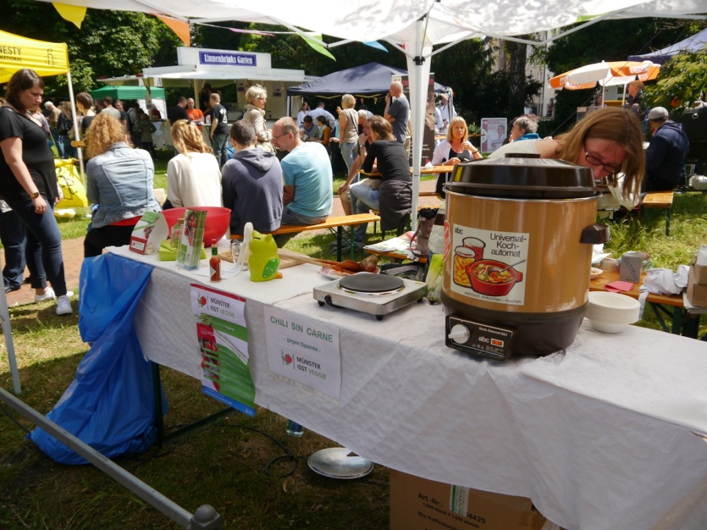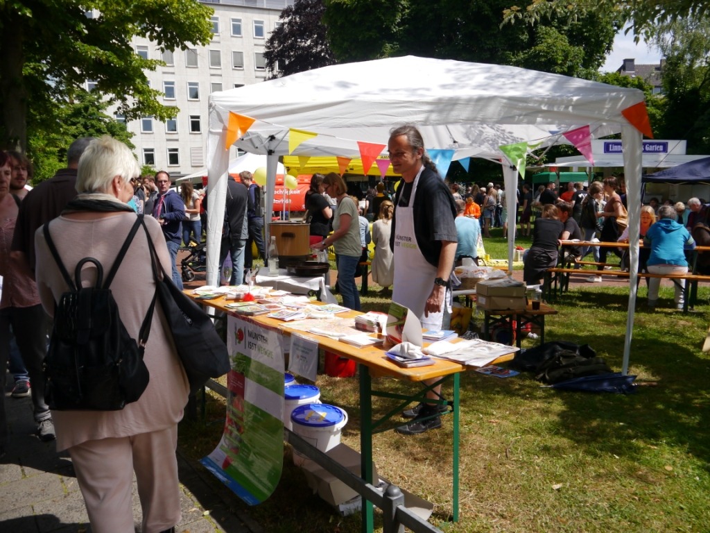 Etwas früher als sonst startete in diesem Jahr das 4telfest im Stadtteil Mauritz, rund um das Cinema. Dieses Stadtteilfest ist außergewöhnlich, denn es gibt kaum kommerzielle Veranstalter, Akteure sind die im Stadtteil ansässigen Bewohner, Vereine, Initiativen und Geschäfte. Da die Initiative „Münster isst veggie“ ihren Sitz seit jeher im Umwelthaus hat, nehmen auch wir – wie jedes Jahr – wieder teil. Und das mit bahnbrechendem Erfolg.