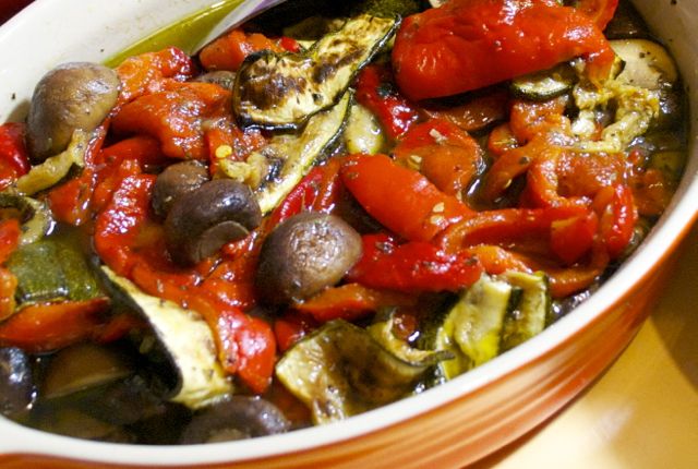 Mit den Händen und einem (stumpfen) Messer die Paprikaschoten von der Haut befreien. Die fertigen Schoten in schmale Streifen schneiden und zusammen mit den gegrillten Zucchini in eine flache (Auflauf-)Schale geben.