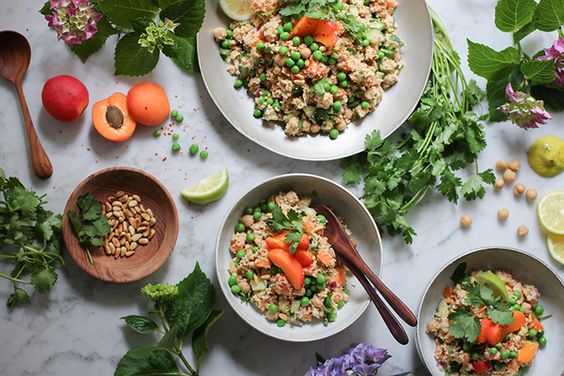 Den gequollenen Couscous durchrühren und mit den Erbsen, den Zwiebel-, Avocodo- und Gurkenwürfeln sowie den Aprikosenstücken und den Pinienkernen vermischen. Salat mit etwas Salz und 1 TL Ras el-Hanout würzen.