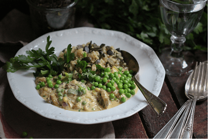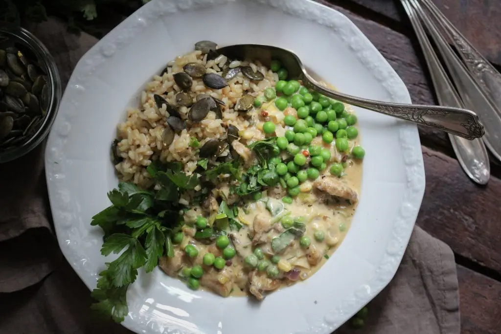 - Erbsen bis auf ein paar EL zum Garnieren in das Geschnetzelte einrühren. Eine Hand voll Petersilie waschen, hacken und unterrühren. Mit Wasser nach Belieben verdünnen und nochmals 10 Minuten sanft köcheln lassen. Mit Muskat und etwas Zitronensaft abschmecken.