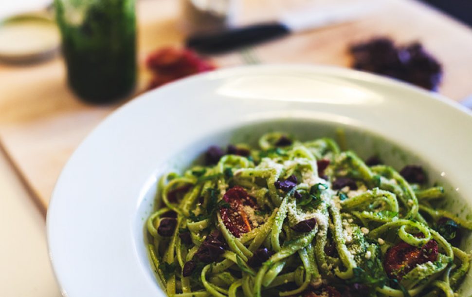 Nudeln/Spaghetti kochen versteht sich von selbst. Die Cashews mahlen, sie dienen als „Parmesan“. Die Oliven & Basilikum hacken.