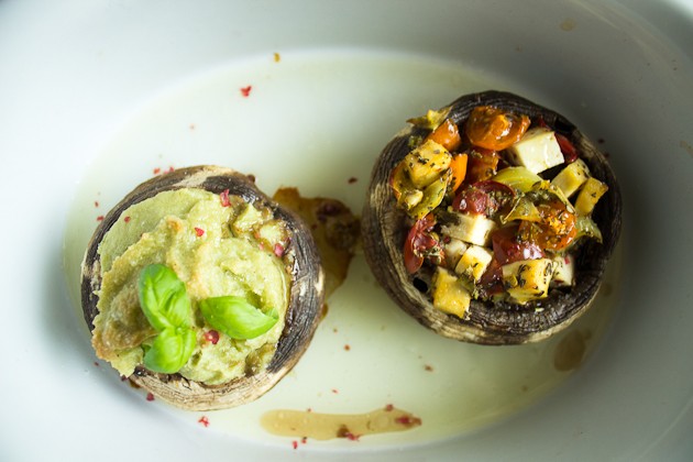 Die Riesenchampignons füllen und für ca. 15-20 Minuten in einer leicht gefetteten Auflaufform in den auf 200°C vorgeheizten Ofen schieben.