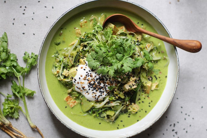 - Zum Garnieren: 2-3 EL ungesüßter Sojajoghurt (ich benutze Sojade), 1 EL schwarze Sesamkörner und 1 TL Koriandersamen (alles optional)