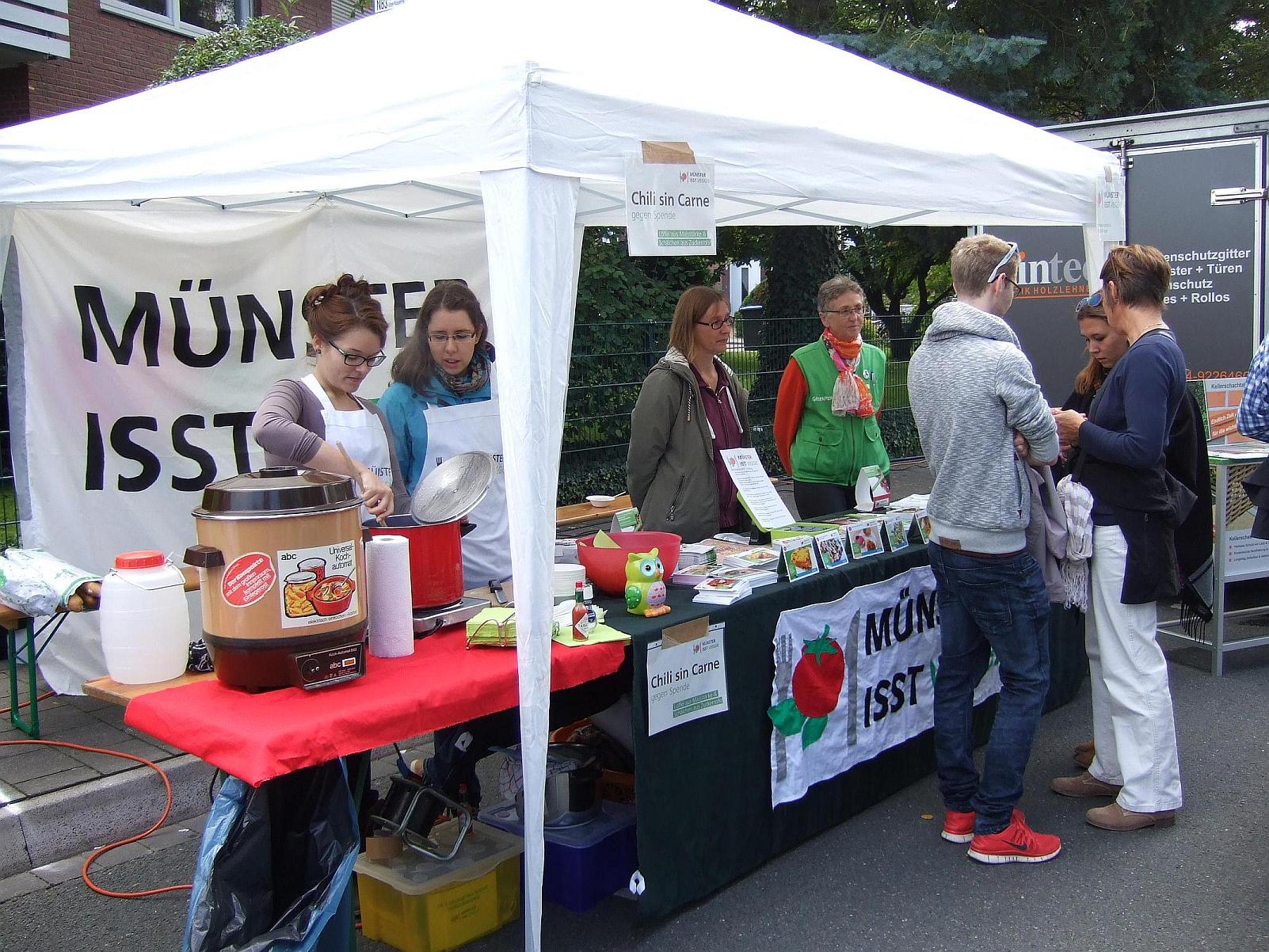 Nach kleinen Anlaufschwierigkeiten, wir mussten doch glatt unseren ganzen Kram 300m weit schleppen, wurde es doch noch eine schöne Veranstaltung mit vielen netten Gesprächen und ganz viel Chili.. Kritik gab es auch, aber deshalb machen wir ja u.A. diese Infostände, uns geht es um Aufklärung über den Vegetarischen Donnerstag und seine Gründe.