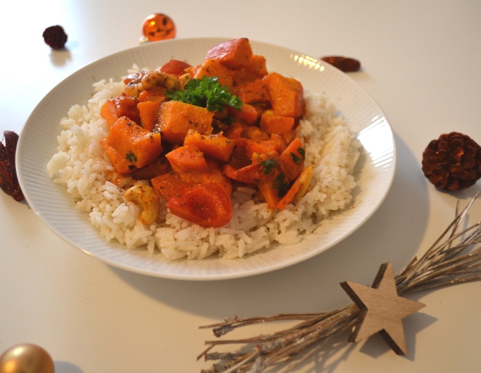 Zwiebel würfeln, Ingwer in kleine Stückchen schneiden. Zwiebelwürfel in restlichem Öl mit den Gewürzen 2 Minuten anrösten. Karotten und Agavendicksaft zugeben. Nach weiteren 3-4 Minuten die Paprika hinzugeben und noch etwas anbraten. Tomaten dazugeben und mit Salz und Pfeffer würzen und gut umrühren. Kokosmilch hinzugeben und ca. 5 weitere Minuten köcheln lassen. Kürbis mit Cashewkernen und Petersilie in das Curry geben, einen Spritzer Zitronensaft hinzugeben.