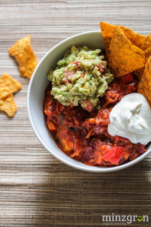 Das fertige Chili auf Schüsseln verteilen, mit etwas Guacamole und den Tortilla Chips toppen.