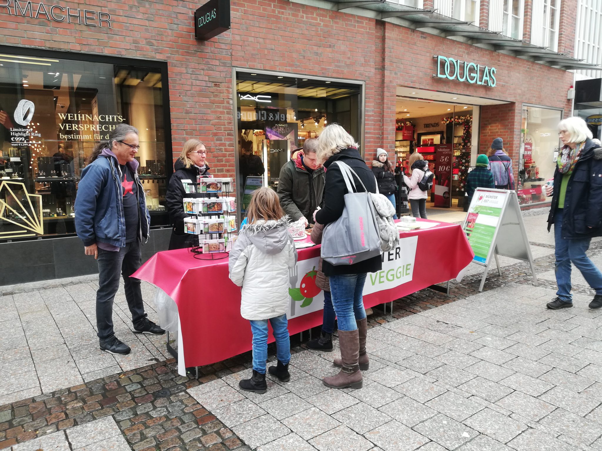 Ohne Braten kein Weihnachten? Der Meinung sind wir auch. Aber auch ohne tierische Produkte kann Weihnachten ein Fest der Genüsse werden. Das haben wir heute mit unseren beiden Kreationen aus Nüssen und Linsen in der Innenstadt gezeigt. Und dem dauerhaft mit interessierten Passant*innen überlaufenen Infostand zufolge hat es geschmeckt.