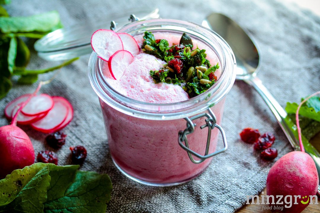 Radieschen waschen, Blätter abschneiden und beiseite legen. Radieschen vierteln und mit Naturjoghurt, Zitronensaft und Ahornsirup gut mixen, mit etwas Pfeffer abschmecken.