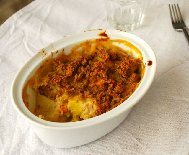 Den „Brei“ mit Hilfe von zwei Teelöffeln auf dem Auflauf verteilen.