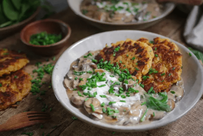 - Schnittlauch waschen und in Röllchen schneiden. Rahmchampignons mit den krossen Kartoffelpuffern anrichten, pro Portion nochmals 2 TL etwas Sojajoghurt einrühren und das Gericht mit reichlich frischem Schnittlauch servieren.