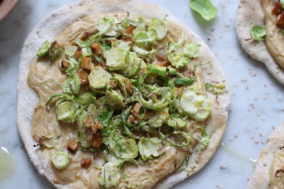 Stufe 3: Zum Schluss den Rosenkohl und die restlichen Zwiebel- und Tofuwürfelchen auf die Fladenbrote geben und nochmals 5 Minuten fertig backen.
