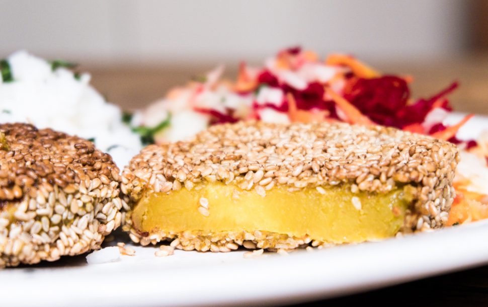 Auf einen weiteren Teller Mehl geben sowie auf einen dritten den Sesam.