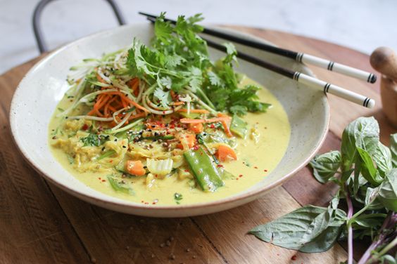 Suppe danach 5-7 Minuten ganz sanft köcheln lassen. Suppe mit 1 TL Kurkuma, Chiliflocken nach Belieben und 2 EL Sojasoße würzen sowie mit Madras Currypulver und weiterer Sojasoße individuell abschmecken.