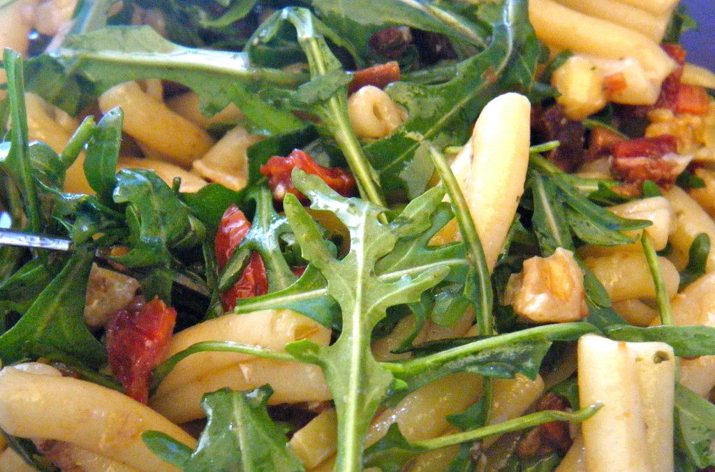 Die getrockneten Tomaten in Streifen, dann in Würfel schneiden, die Oliven grob hacken, genauso die Walnüsse. Alles zu den Nudeln geben und vermengen. Rucola waschen und putzen und mit den Händen grob zerrupfen, zu den Nudeln geben und unterheben.