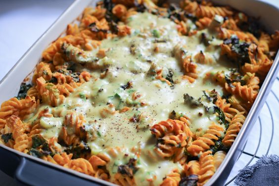 Die gekochten Nudeln in eine große Auflaufform geben. Die Selleriestückchen und den Grünkohl untermengen. Nudeln nochmals kräftig salzen.