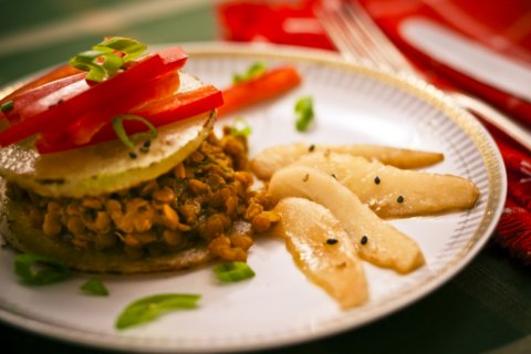 5. Die Kohlrabischeiben und die Birnenscheiben von beiden Seiten für je 3 Minuten in einer kleinen Pfanne mit 1 TL Olivenöl und einer Prise Salz sanft anbraten, bis ein wenig Farbe entsteht. Jetzt eine Scheibe Kohlrabi auf den Teller geben. Die Linsen darauf geben und mit der zweiten Kohlrabischeibe abdecken. Die Birnen fächerförmig neben den Linsen anrichten und alles mit dem Rest der Paprikastreifen, dem Sesam und den Frühlingszwiebeln garnieren!