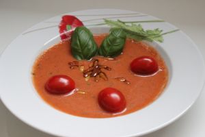 Wassermelone, Tomaten, 100 ml Öl, Basilikum und Knoblauch im Mixer pürieren und durch ein Sieb streichen. Mit Balsamico, Salz, Pfeffer und Cayenne würzen.