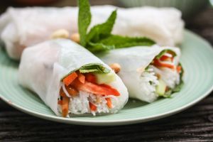 Legt die eingeweichten Reispapiere nun einfach auf ein Küchenbrett und fangt an sie zu befüllen. Befüllen könnt ihr nach Lust und Laune, von allem eben ein bisschen. Nicht zuviel, nicht zu wenig – nach ein, zwei Rollen habt ihr schon raus, wieviel Füllung optimal ist Gebt die Füllung einfach der Länge nach in die Mitte, schlagt das Papier anschließend oben und unten nach innen, schlagt dann das linke Ende auch nach innen und rollt es dann von rechts „straff“ auf. Hört sich komplizierter an als es ist! Einfach loslegen!