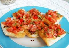 Brot (Baguette, Chiabatta, etc.) in dicke Scheiben schneiden, Tomaten würfeln und Basilikum hacken. Knoblauchzehe im heißen Olivenöl schwenken, dann die Brotscheiben von beiden Seiten knusprig braun braten. Brot mit Salz und Pfeffer würzen und auf Tellern anrichten.