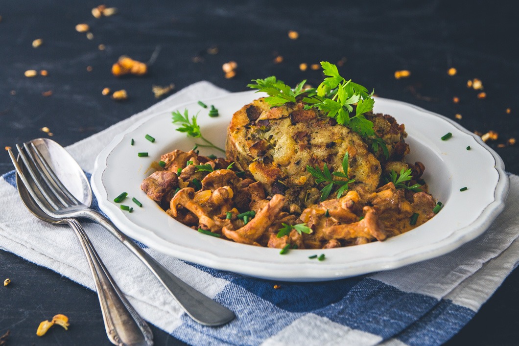Für die Serviettenknödel das trockene Brot klein würfeln und in eine Schüssel geben. Sojamilch aufkochen und die Brotstücke damit gleichmäßig übergießen und kurz vermengen. Die Schüssel mit einem Topfdeckel abdecken und 15 Min. ziehen lassen.