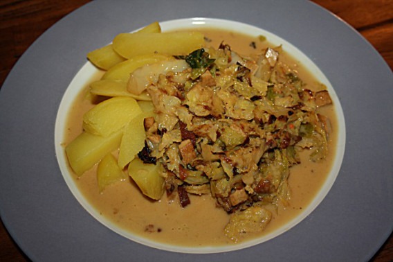 Rahmwirsing zuzubereiten ist denkbar einfach und benötigt keine genauen Mengenangaben: gute zwei bis drei Zwiebeln in einer hohen Pfanne anbraten (halbiert und in dünne Scheiben geschnitten), den in Streifen geschnittenen Wirsing hinterher und eine ganze Weile anbraten. Ich warte ab, bis er anfängt zu bräunen. Dann kommt man aromatisch auf volle Kosten.
