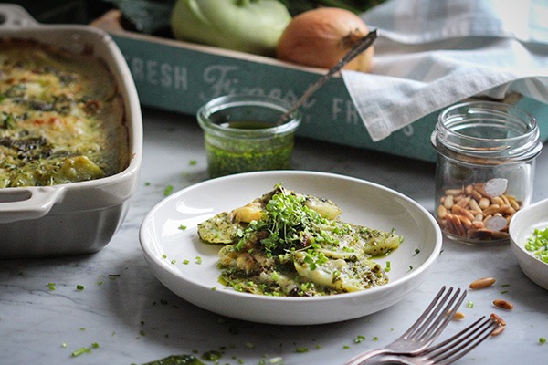 Nun die restliche vegane Bechamelsoße und etwas Kohlrabi-Pesto auf dem Gratin verteilen.