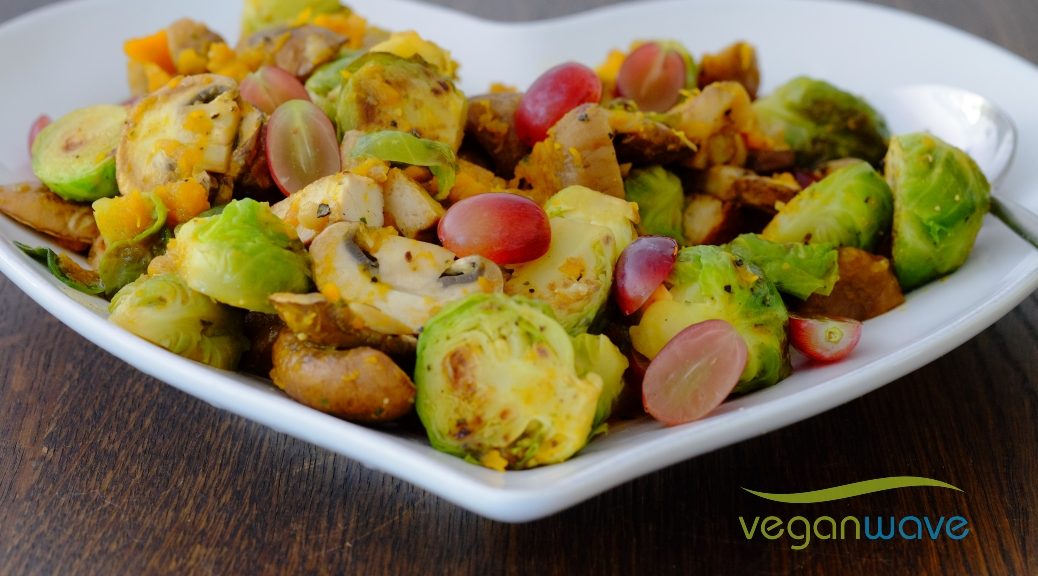 - Die Flüssigkeit ist dann auch überwiegend eingekocht/verdammt. Mit Pfeffer und etwas Satz abschmecken und noch heiß in eine Schüssel geben. Anschließend die Trauben und die Tofuwürfel mit unter rühren – fertig!!!Zum Reinlegen. Ein wirklich großartiges, einfaches, überaus delikates Herbstgericht! Danke Fisch für die geniale vegane Rosenkohl-Maronen-Pfanne!