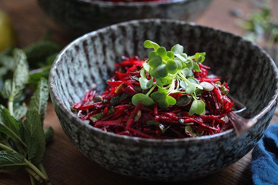 Ihr könnt den Salat idealer Weise auch über Nacht im Kühlschrank ziehen lassen. Wenn er gut durchzieht, wird er noch köstlicher und die Apfelstreifen verfärben sich so dunkelrot, dass man sie gar nicht mehr von der Roten Bete unterscheiden kann. Die Sprossen gebe ich vor dem Servieren frisch auf den Salat. Wenn Ihr keine Sprossen habt, garniert den Salat einfach mit ein paar Minzblättern.