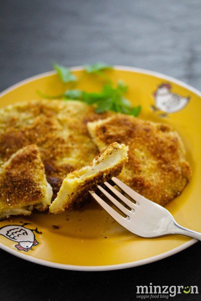 Sellerie schälen und in etwa 1cm dicke Scheiben schneiden. Anschließend etwa 5min weich kochen, bis man mit der Gabel hineinstechen kann. Die Scheiben aus dem Wasser herausnehmen und auf etwas Küchenpapier abtropfen und abkühlen lassen. Etwas Mehl auf einen flachen Teller geben und mit Kurkuma und Paprikapulver mischen. Die weichen Selleriescheiben damit bestäuben, anschließend durch das Stärkewasser/Sojamehlgemisch/