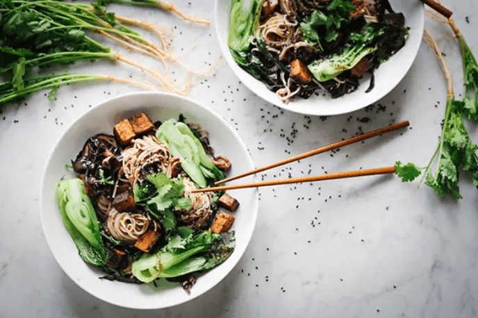 - Soba-Nudelwasser abgießen. Koriander, Algen sowie Rotkohl und Shitake unter die Soba-Nudeln heben. 4 EL Reisessig, 1-2 EL Sojasoße sowie 1 EL helle geröstete Sesamkörer und 1 EL schwarze Sesamkörner untermengen. Nudeln mit einer Gabel aufwickeln und in einzelnen Häufchen auf den Tellern anrichten. Den restlichen Rotkohl und verbliebene Shiitake mit der Flüssigkeit aus der Pfanne um die Nudelhäufchen drappieren. Tofustücke aus dem Ofen holen und ebenfalls über die Nudeln geben. Pak Choi auf die Teller geben. Das Gericht mit hellem und schwarzem Sesam sowie etwas Koriander garniert servieren.