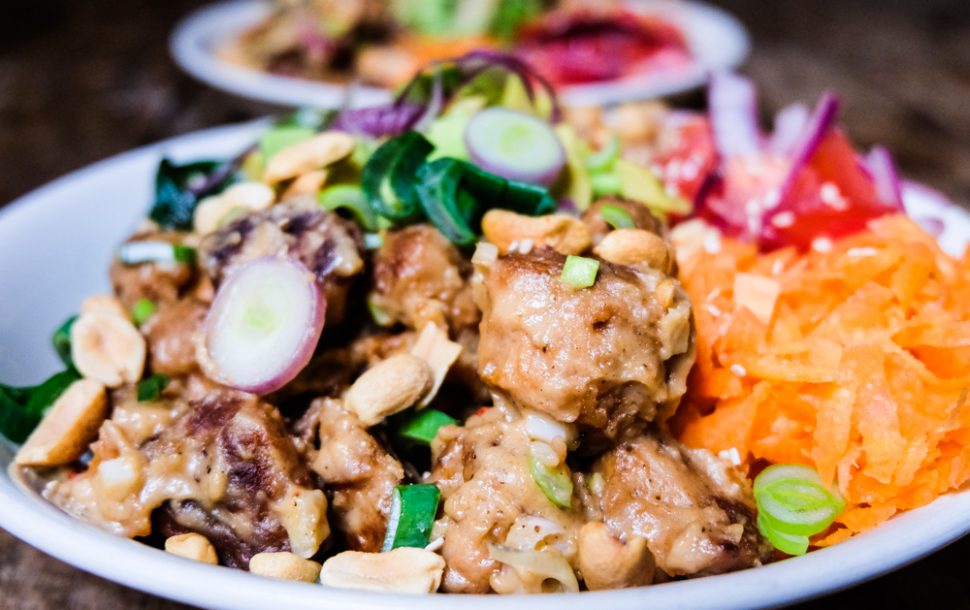 Wer weniger Grünzeug auf dem Teller möchte kann als Beilage z.B. auch Reis servieren. Die Erdnuss Chunks passen aber ebenso zu Reisnudeln, Glasnudeln, Hirse, Couscous, Quinoa & co. Alternativ könnt ihr natürlich auch gebratenes Gemüse mit zu den Chunks in die Pfanne packen (in diesem Fall am besten mindestens die doppelte Menge an Sauce zubereiten!).