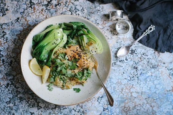 1 EL Kokosöl in einer Pfanne erhitzen 6 Pak Choi Köpfchen halbieren und beidseitig im heißen Fett anbraten, etwas salzen und mit Zitronensaft beträufeln.