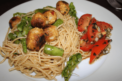 Aus der Masse kleine Bällchen formen und in etwas Olivenöl anbraten, dabei die Bällchen ständig in der Pfanne herumrollen lassen um eine gleichmäßige Bräunung zu erhalten. Nach dem Braten können die Tofubällchen im Ofen warm gehalten werden bis die Spargel-Pasta fertig ist.