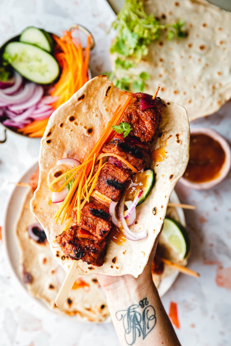 - Rote Zwiebel in Stücke schneiden, abwechselnd mit den marinierten Seitanwürfeln auf Spieße spießen, mit der übrigen Marinade bestreichen und für 2 Minuten pro Seite über direkter und anschließend für weitere 4 Minuten über indirekter Hitze grillen.