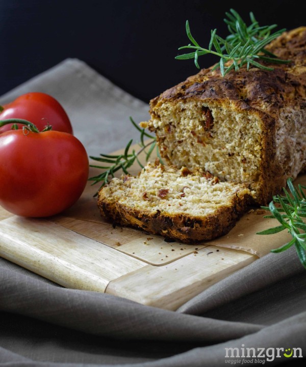 Die Margarine auf niedriger Temperatur in einem Topf zerlassen, anschließend etwas abkühlen lassen. Zusammen mit den Tomatenwürfeln, Rosmarin und den restlichen Zutaten in eine Schüssel geben und mit einem Knethaken zu einem Teig verarbeiten. Anschließend mit einem Tuch abdecken und an einem warmen Ort gehen lassen, bis er sich verdoppelt hat (dauert etwa 90min).