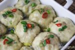 Für den Teig die Kokosnussmilch gut schütteln, umrühren und in eine große Schüssel füllen. Mit Mehl, Backpulver und einer Prise Salz zu einem glatten Teig verrühren. Ist er noch zu klebrig, etwas Mehl dazu geben. Anschließend eine Arbeitsfläche bemehlen und den Teig zu einer dicken, langen Rolle formen. 12 gleichgroße Teile abtrennen, zu Kugeln formen und kreisförmig flach drücken. Sie sollten etwa einen halben Zentimeter dick sein, damit sie später beim Dämpfen nicht reißen. Etwa 1-2 EL der Pilzmischung auf die Mitte der Teigkreise setzen, dabei sollten 2cm zum Rand frei bleiben. Den Teig von außen nach innen zusammenschlagen und vorsichtig fest drücken. Mit der „Naht“ nach unten in starke oder doppelte Papierförmchen legen. Für die Auberginen-Tomaten-Füllung wiederholen.