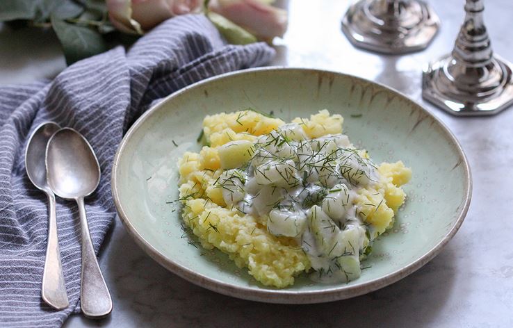 Kohlrabi nochmals kurz erwärmen und die Soße bei Bedarf mit Wasser oder Pflanzendrink strecken. Kartoffelpüree mit cremigem Kohlrabi und noch etwas Dill garniert servieren.
