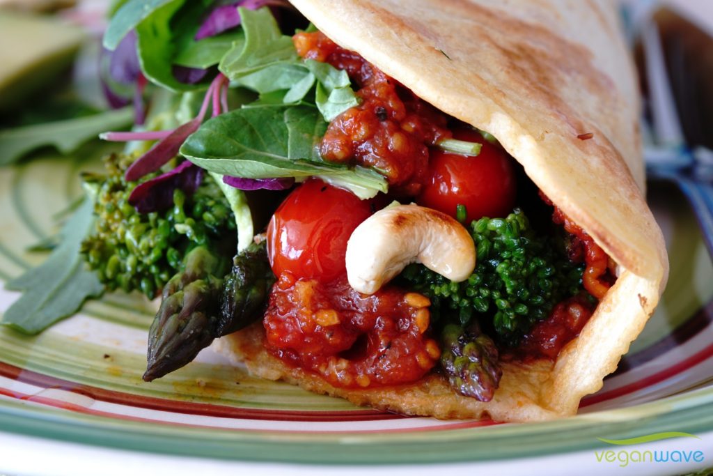 Omelette auf einen Teller legen, mit 2 EL Sauce bestreichen, die Hälfte des Gemüses, der Salatblätter sowie der Cashewkerne gleichmäßig verteilen. Das Omelette einmal falten. Analog mit dem 2. Omelette verfahren. Guten Appetit!