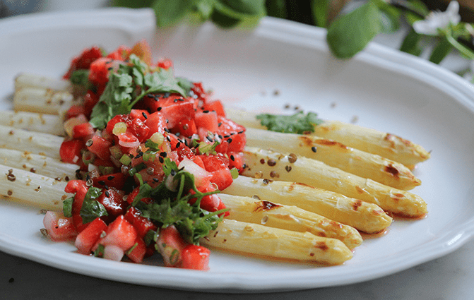 Spargel auf Tellern anrichten und mit Erdbeer-Salsa servieren. Das Gericht mit Korianderblättern und 1-2 TL schwarzem Sesam garnieren.