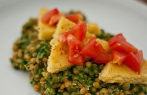 Polenta aus dem Ofen holen. Paprika, Salz und Pfeffer darüber geben und mit einem Messer kleine Dreiecke schneiden. Linsen und Spinat auf die Teller verteilen und die Polenta-Ecken dazu anrichten. Die Tomate würfeln und darüber geben.