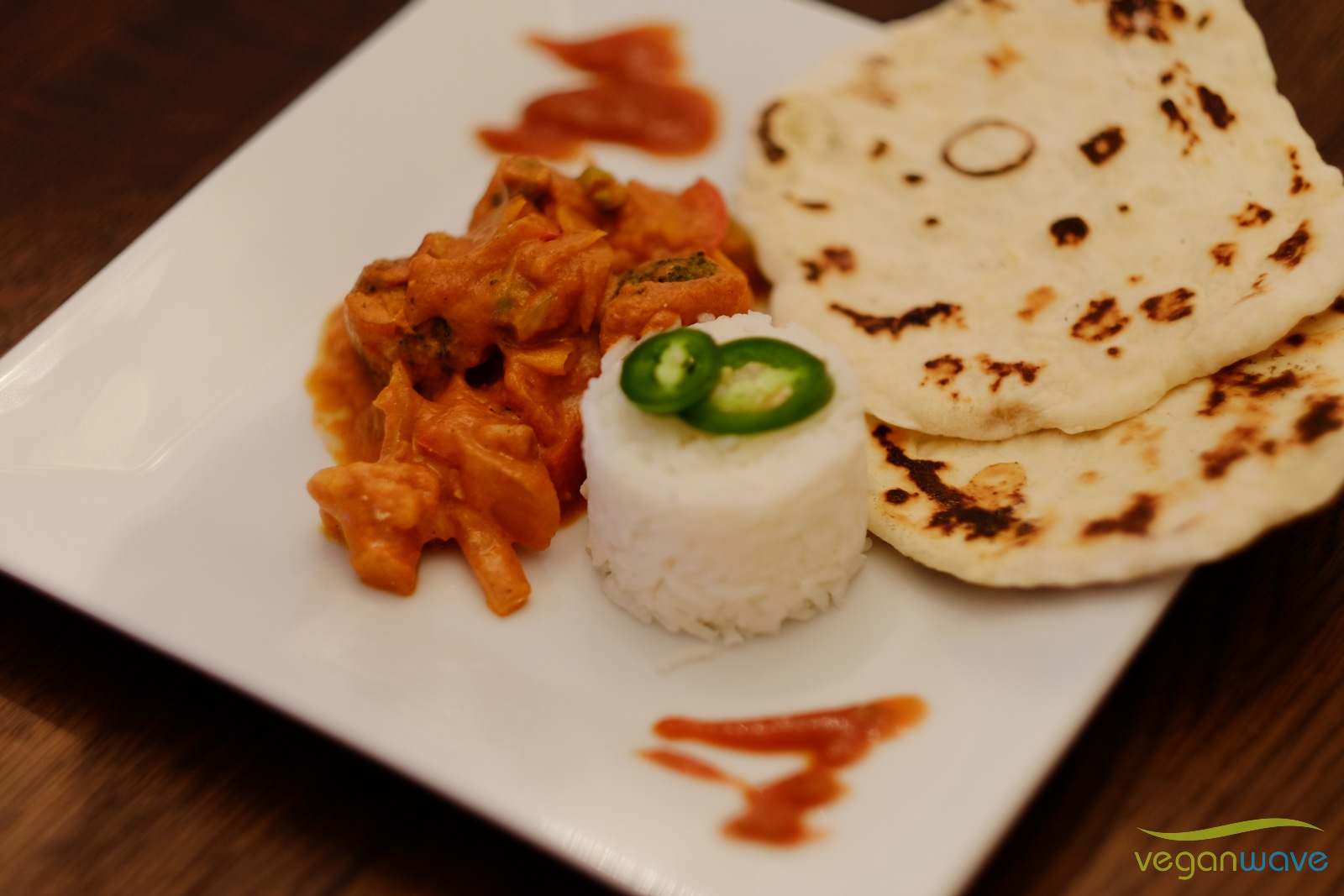 Reis und Curry auf einen Teller geben, dazu Naan Brot mit dem Tomaten-Chili-Mango-Dip reichen.